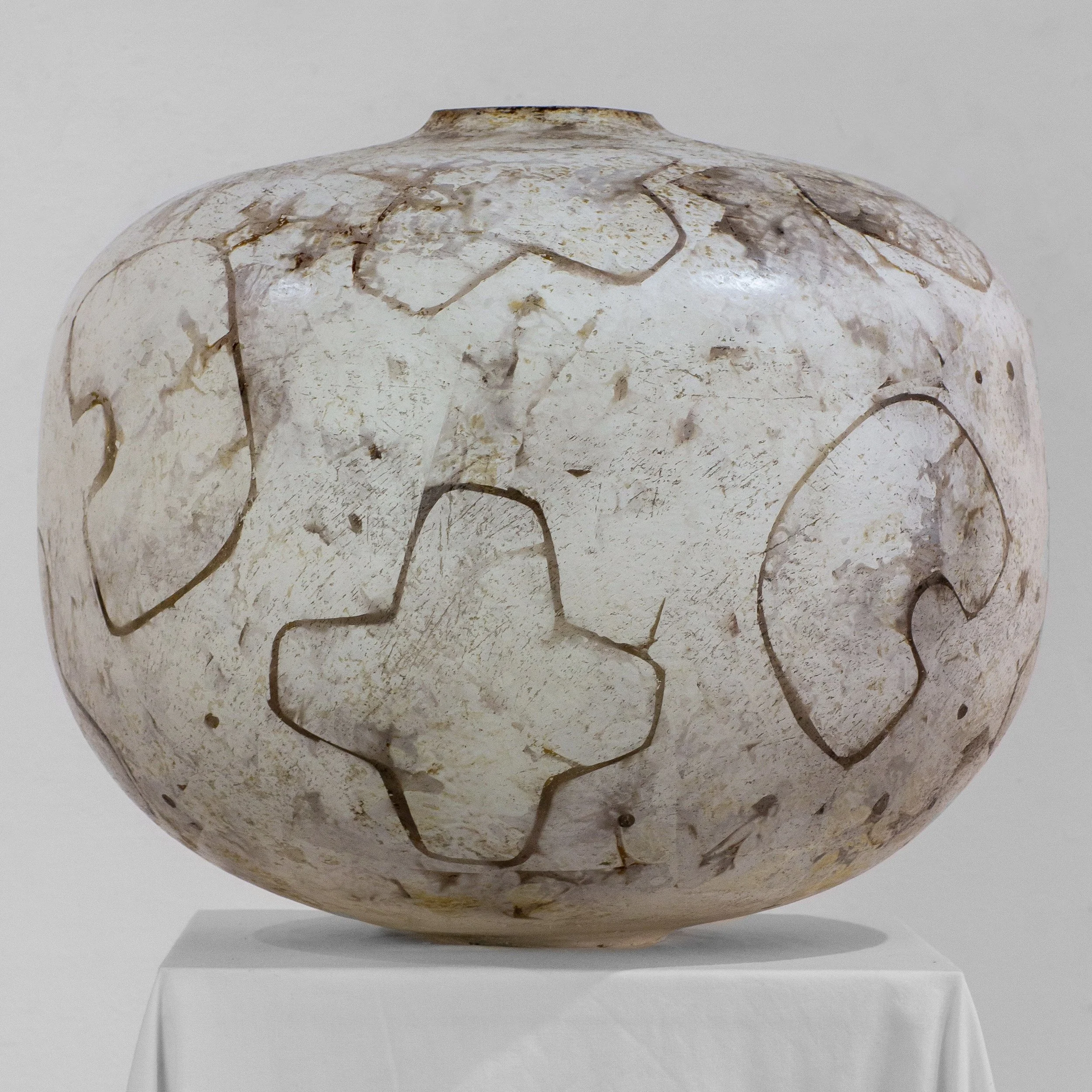 The patterns on Jane’s vessels occur as a result of the resist work, made from paper, that is applied to the burnished vessel. The vessel is then smoke fired in Jane’s garden, the resist work deteriorating to form the organic ally made surface pattern.