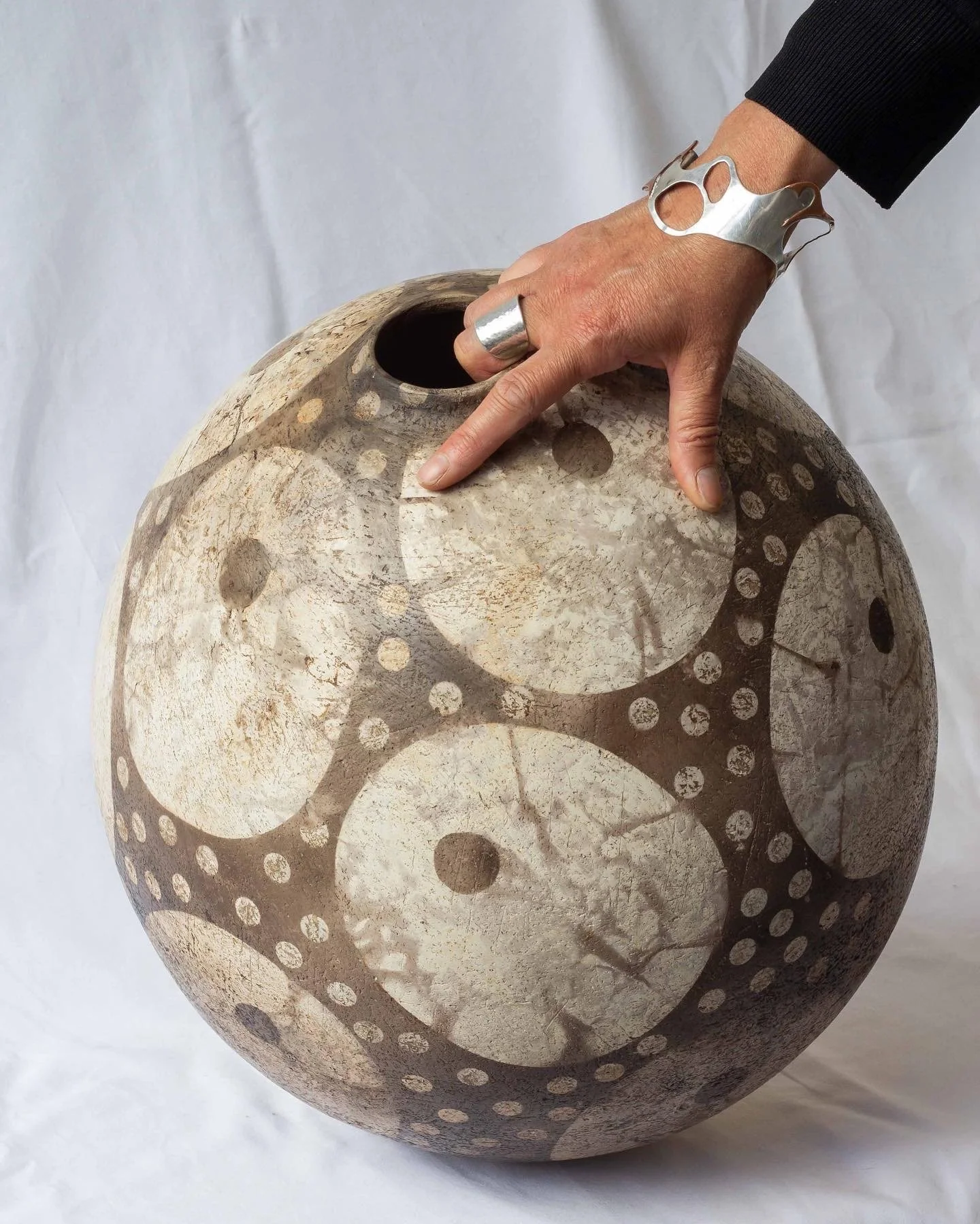Manna | Hand coiled, burnished & smoke fired ceramic vessel | 50cm diameter